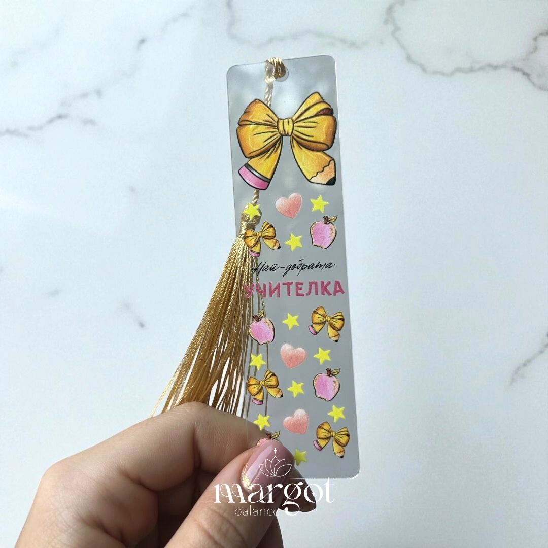 Стилен книгоразделител с пискюл и надпис „Най-добрата учителка“ – малък, но значим подарък за 15 септември, края на учебната година или 24 май. Перфектен за всяка учителка, която обича да чете и цени символичните жестове.