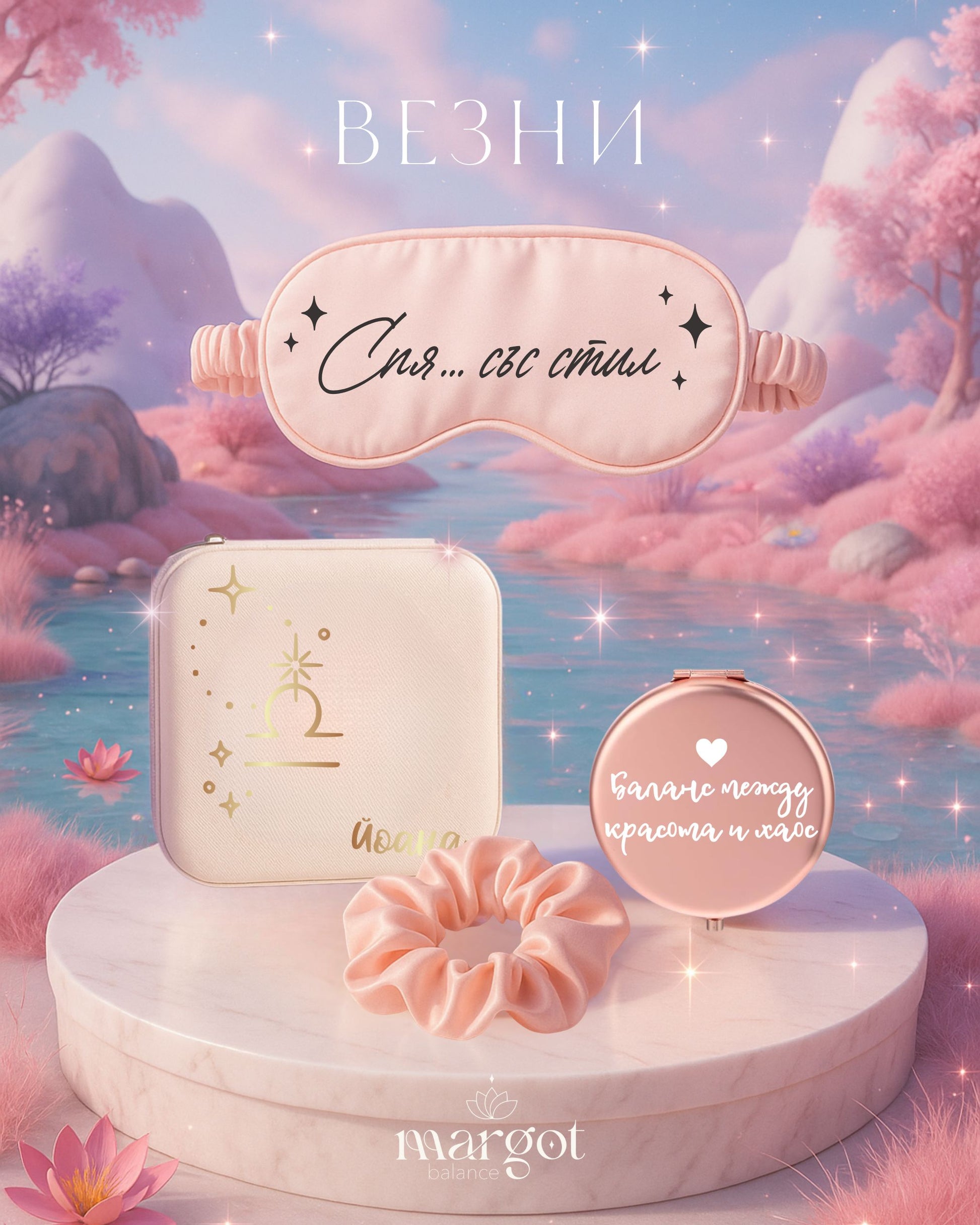 Елегантен комплект за зодия Везни – персонализирана кутия, огледало, маска и скрънчи. Създаден за хармоничните и естетично настроени дами. Перфектен баланс между форма и съдържание.