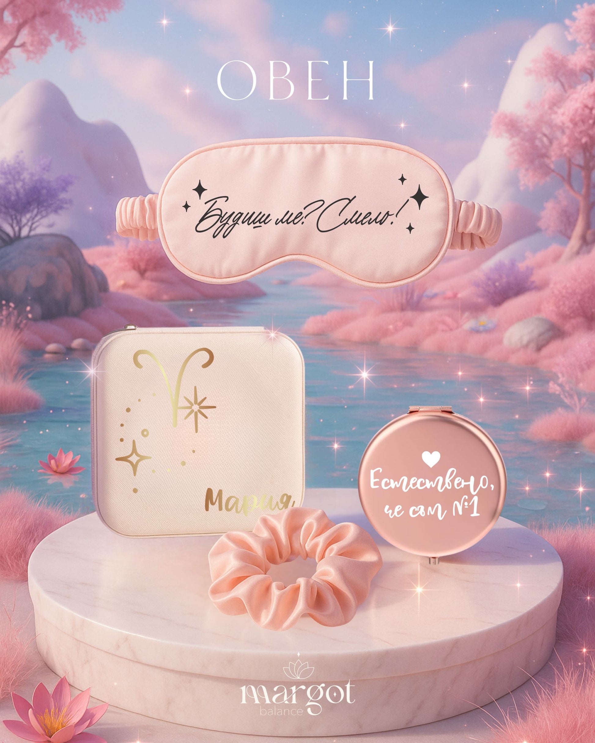 Търсиш специален подарък за жена зодия Овен? Представяме ти уникален комплект, вдъхновен от зодиакалната енергия на Овена. Включва ръчно изработена кутия за бижута със съзвездието и персонализирано име, сатенена маска за сън с послание, компактно огледало с вдъхновяващ текст и нежно скрънчи. Перфектен за рожден ден, имен ден или изненада без повод. Персонализиран и изработен с внимание към всеки детайл. Изненадай специална жена с подарък, който говори от сърце.
